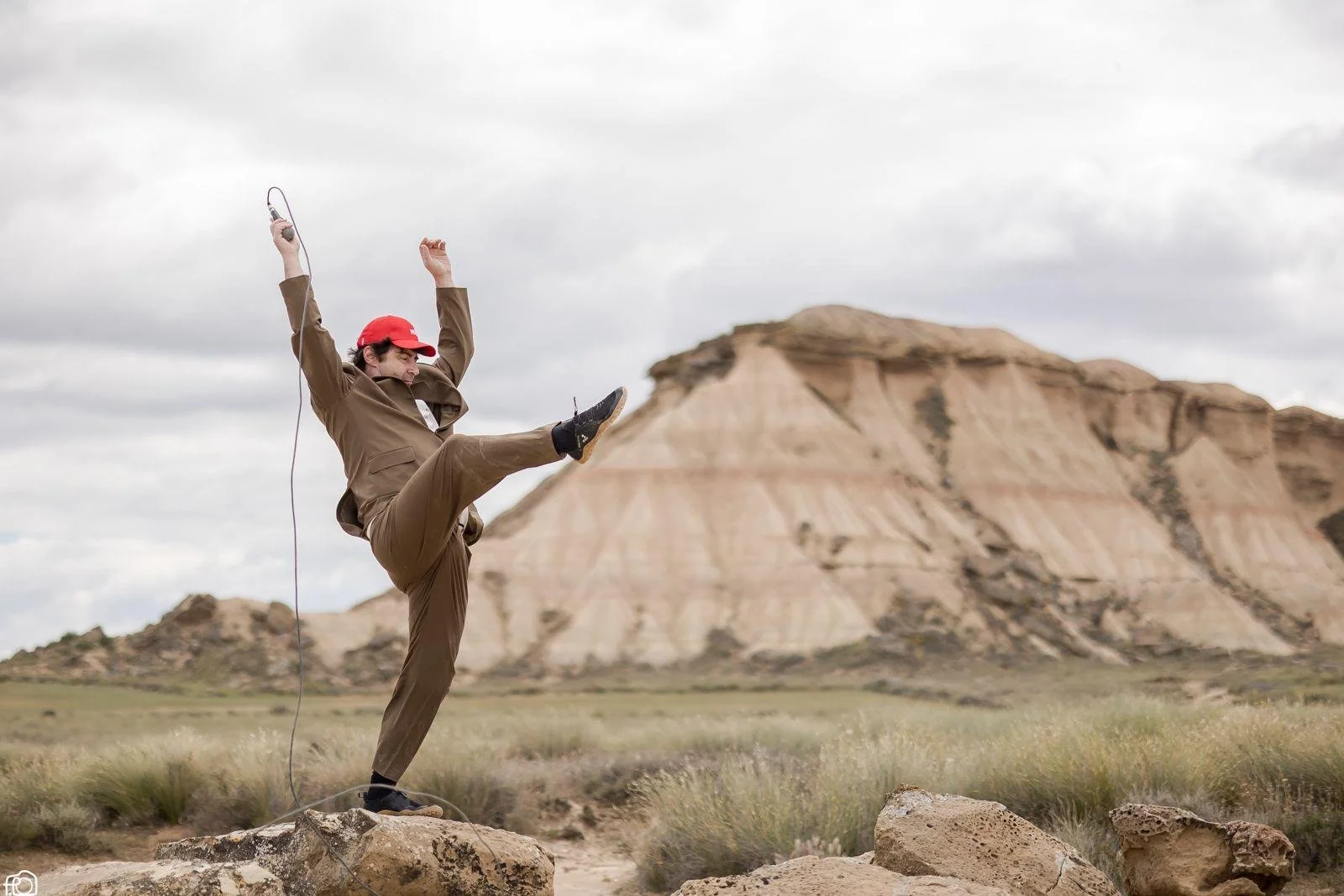 Like a kind of cowboy of our era, armed only with cables and a microphone, a man peers into the abyss that is speaking to a crowd, an individual facing a multitude, a person among a mass of people and a wall, an artist caught between a rock and a hard place.